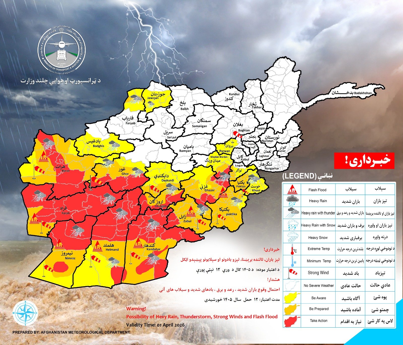 اداره هواشناسی وزارت ترانسپورت و هوانوردی از احتمال بارش باران، سیلابها رعد و برق و تُندبادها در برخی ولایتهای کشور خبر میدهد.