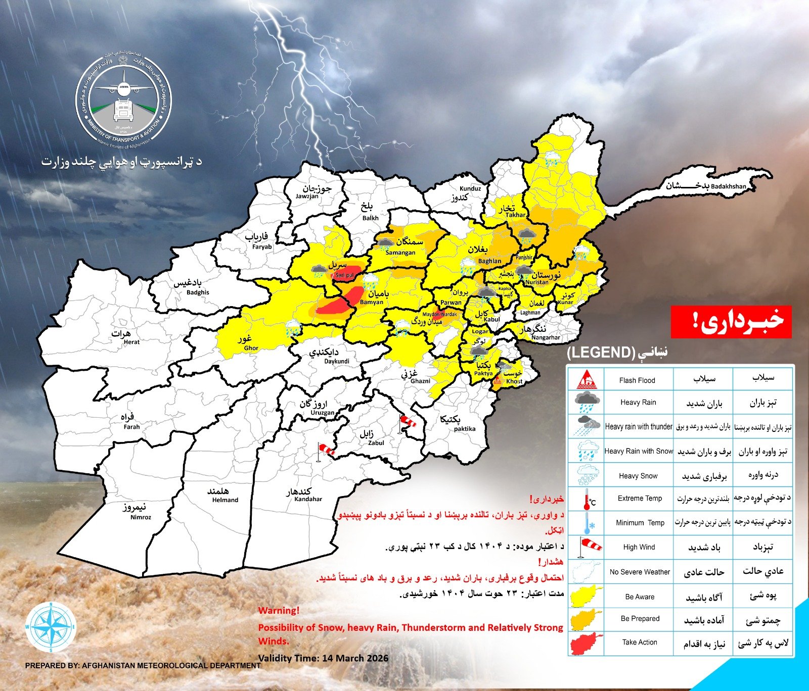 در خبرنامه این وزارت آمده که، این احتمال امروز در ۲۱ ولایت وجود دارد که مقدار باران در نقاط مختلف بین ۱۰ الی ۳۰ ملیمتر و مقدار برف ۱۰ الی ۳۰ سانتیمتر پیشبینی شده است.