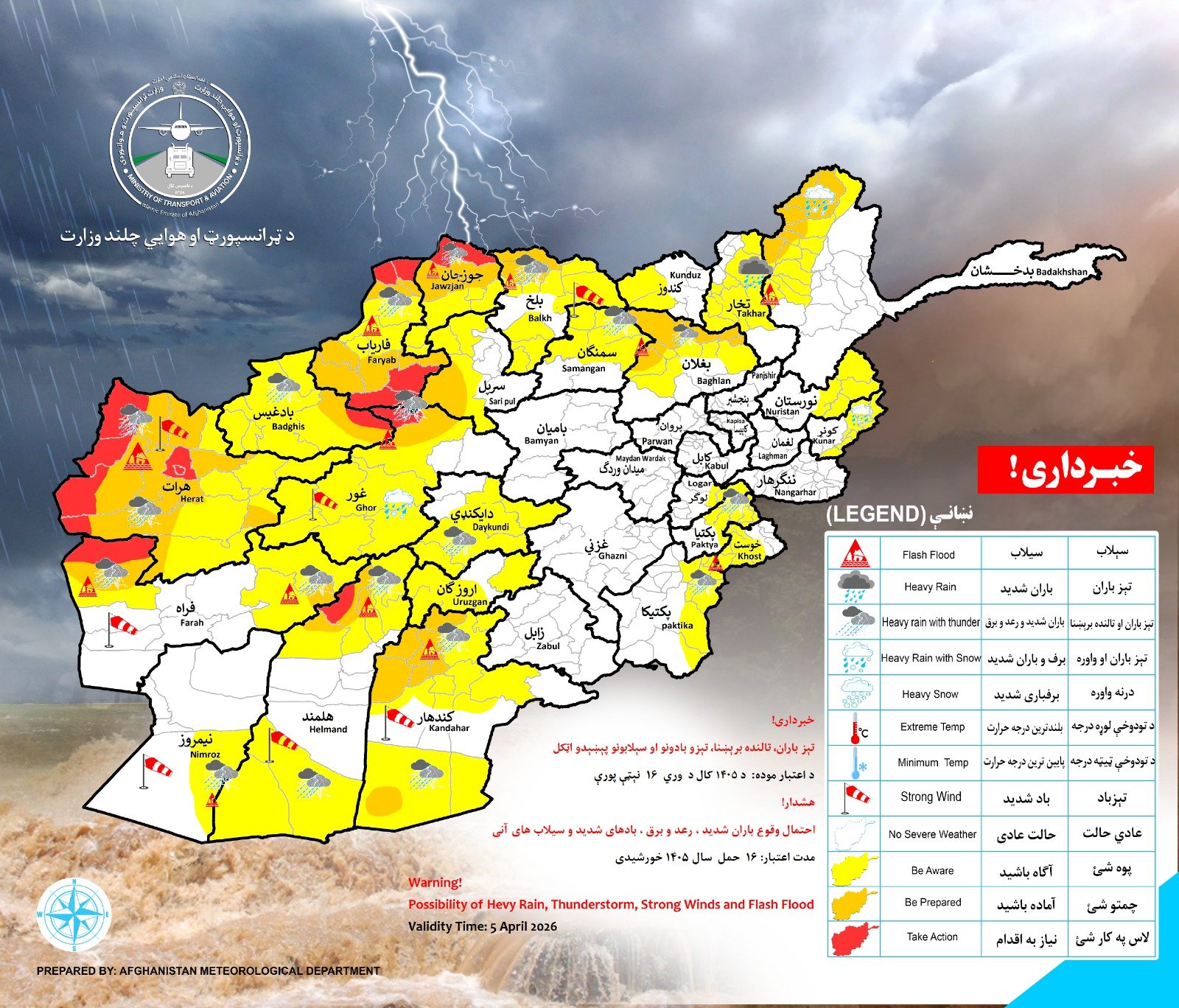 اداره هواشناسی وزارت ترانسپورت و هوانوردی از احتمال بارش شدید باران، جاری شدن سیل، رعد و برق و تُندبادها در ۲۴ ولایت کشور خبر میدهد.