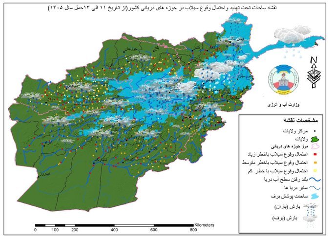 این وزارت همچنین میگوید، احتمال بلندرفتن سطح آب در مسیر دریاهای هرات، غور، بادغیس، فراه، نیمروز، هلمند، کندهار، ارزگان، زابل، جوزجان، سرپل، فاریاب، بلخ، سمنگان، غزنی، لوگر، میدان وردک، کابل، پنجشیر، کاپیسا، پروان، پکتیکا، پکتیا، خوست، ننگرهار، لغمان، کنر، نورستان، بدخشان، تخار، کندز و بغلان وجود دارد.